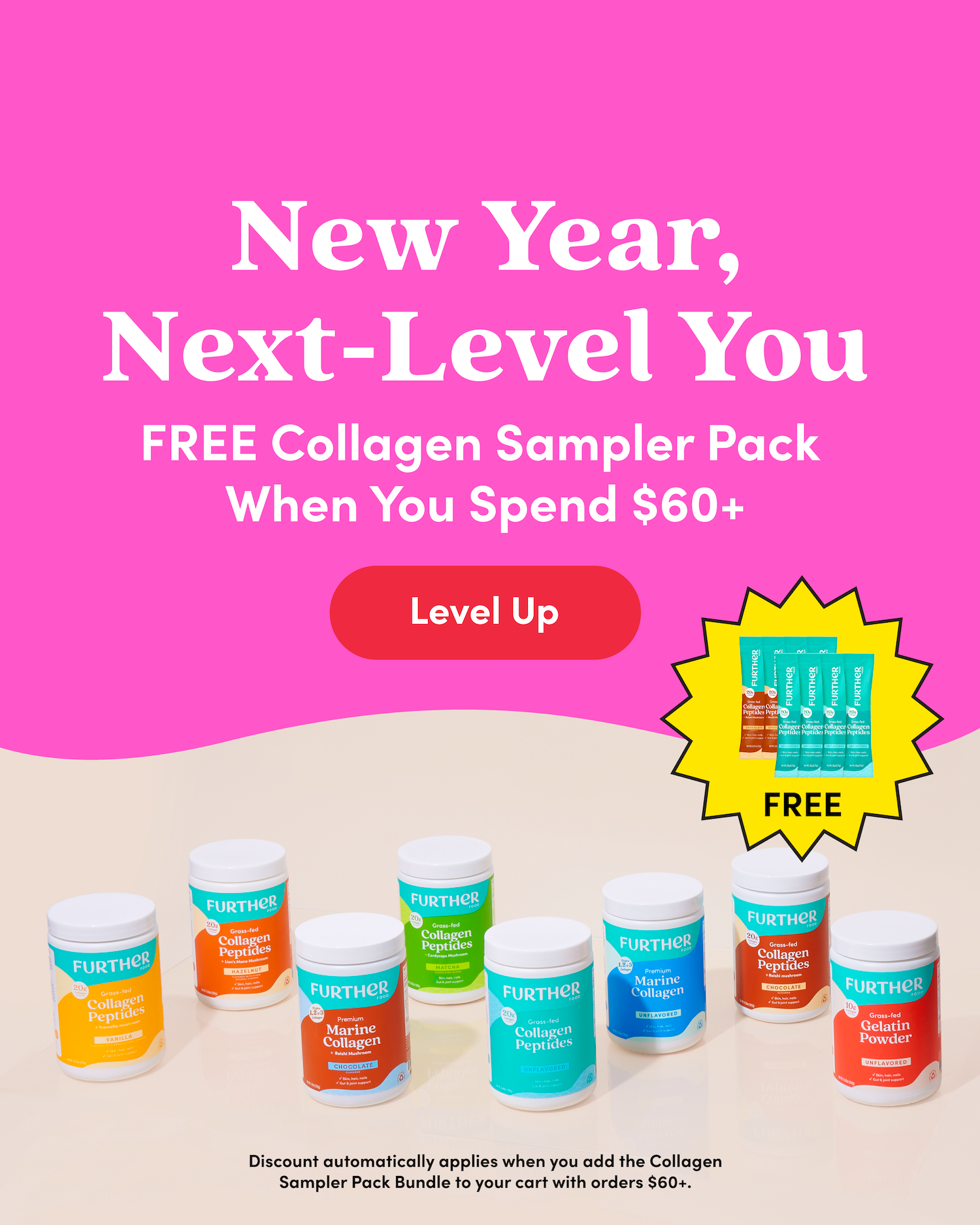 Packed with 20 grams of grass-fed, pasture-raised collagen per scoop get glowing skin, stronger nails and hair faster than ever before! Take your collagen routine Further.