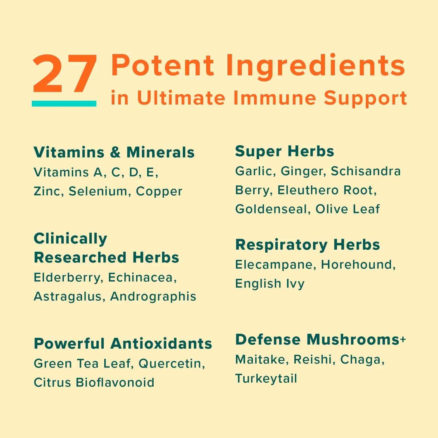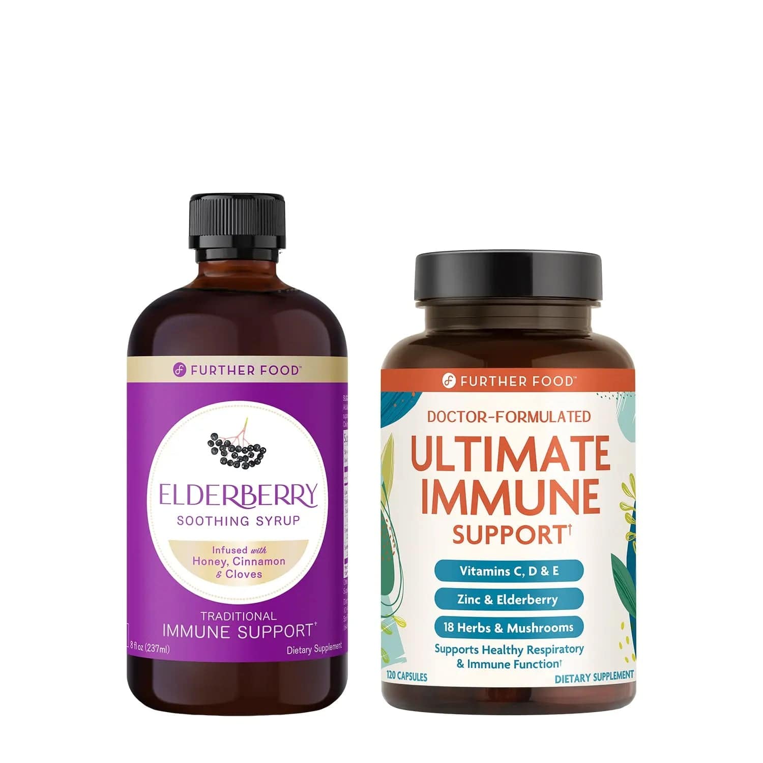 This powerhouse duo of immune support supplements harness nature's most potent ingredients for year round immune support. Ultimate Immune Support boasts 27 immune-boosting ingredients while Elderberry Soothing Syrup promotes daily support with a delicious syrup that kids (and adults!) love.